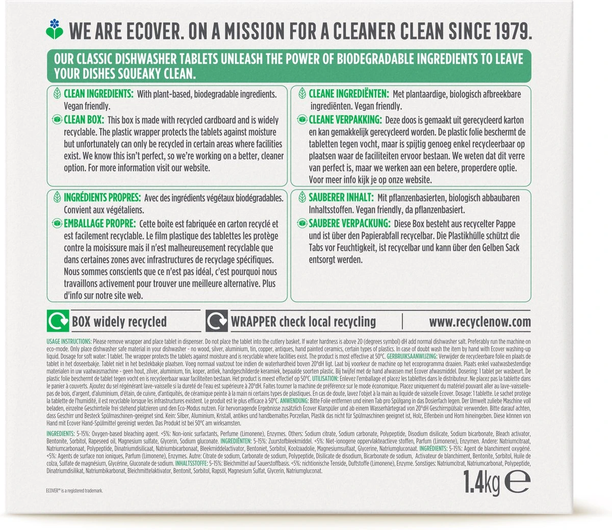 De Ecover Vaatwastabletten Classic zijn biologisch afbreekbare superhelden. Ze rekenen af met aangekoekte etensresten en vet dankzij de krachtige, plantaardige ingrediënten voor een sprankelend schone en streeploze vaat. En zoals altijd, zonder gebruik van fosfaten.