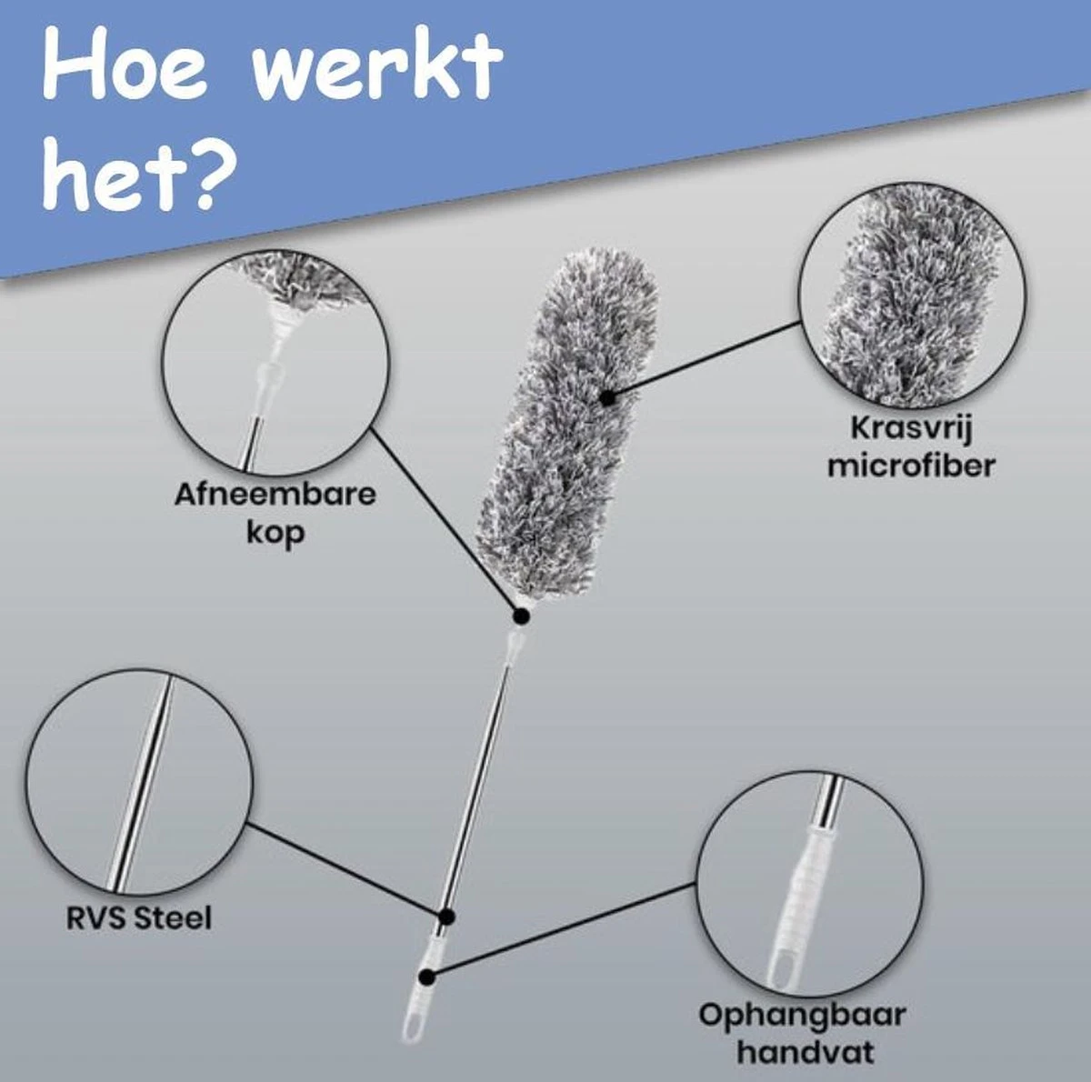 De haren van de plumeau zijn gemaakt van microvezels. Dit zorgt ervoor dat de plumeau een statische werking heeft waardoor stof en vuil eenvoudig worden aangetrokken. In plaats van het stof te verplaatsen, worden stofdeeltjes gemakkelijk aangetrokken en door de microvezelharen opgenomen. Perfect voor het snel, maar grondig stoffen van het huis zonder te veel inspanning.
