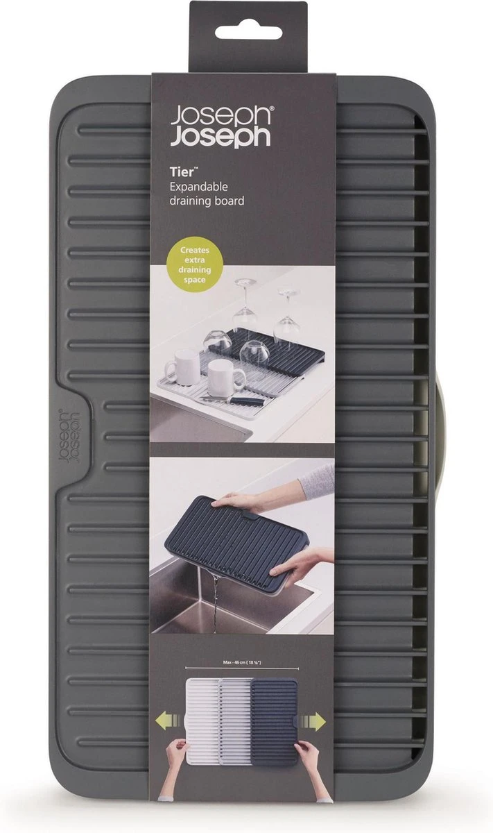 Met de Tier uitschuifbare afdruipmat van Joseph Joseph ben je voortaan verlost van een waterballet op het aanrecht. De mat is uitschuifbaar in 3 delen wat ervoor zorgt dat je genoeg ruimte hebt voor het laten uitlekken van kopjes, glazen en kommen. De mat is voorzien van een eveneens uitschuifbaar afvoergootje waardoor het overtollige water rechtstreeks in de gootsteen gegooid kan worden. De geïntegreerde ribbels zorgen ervoor dat er geen water achterblijft in de kopjes, glazen en kommen. Na gebruik kan de afdruipmat weer worden ingeklapt voor ruimtebesparing.