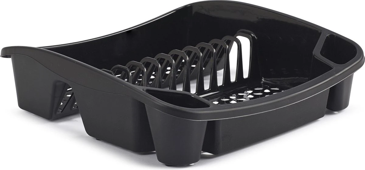 Afdruiprek zwart. Het rek heeft ruimte voor undefined borden en beschikt tevens over 2 bestekbakken en nog een ruimte voor glazen en bekers. Afmeting: ca. 37 x 40 x 11 x 8 cm. Materiaal: kunststof. Keukenbenodigdheden – Afwassen/afdrogen – Afwasrekken – Afdruiprekken met lekbak.